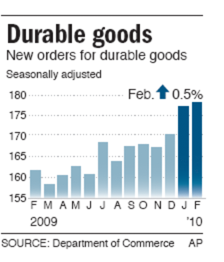 The big jump in demand for commercial aircraft was offset by a 1.9 percent drop in demand for motor vehicles, which followed an even bigger 2.3 percent fall in the category in January. Automakers are still struggling to emerge from a steep recession, which has depressed sales and forced General Motors and Chrysler briefly into bankruptcy last year. They emerged with the help of billions of dollars in government support.
