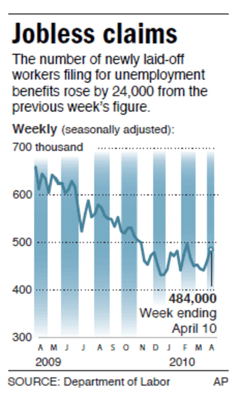 In its report on unemployment claims, the government said the number of newly laid-off people signing up for jobless aid last week surged 24,000 to a seasonally adjusted 484,000. That was the most since late February. Economists had predicted a drop in first-time claims.