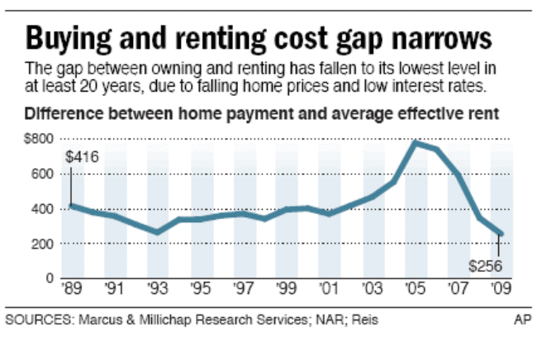 The analysis of 45 metro areas found the difference between the monthly mortgage payment on a median-priced home and the median rent is down to $256. The last time that gap was anywhere near that small was in 1993 when it fell to $264, according to the study.