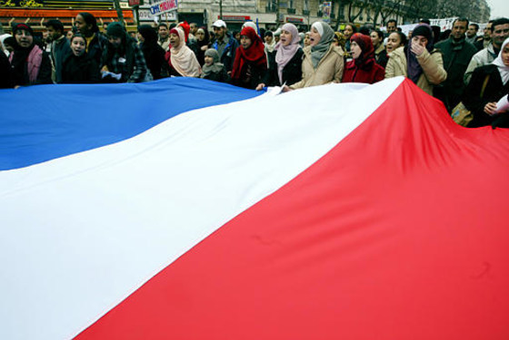 Thousands of people, many of them women wearing head scarves, marched in France Saturday to protest a law banning the Islamic coverings and other religious apparel in public schools.