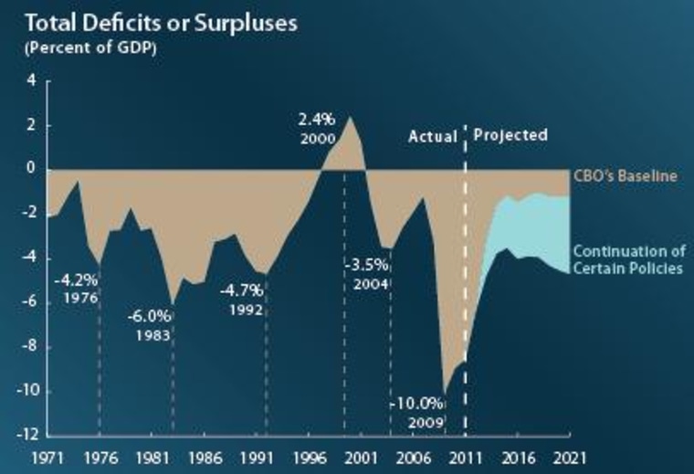 Deficits could be even larger if CBO's economic forecast, which is more optimistic than private projections, proves to be too rosy. The agency doesn't foresee another recession but modest economic growth over the next few years. And it expects the unemployment rate to fall only slightly, to 8.5 percent in the last three months of 2012, and staying above 8 percent through the following year.