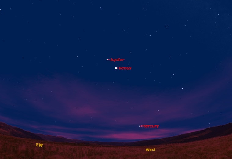 But the moon isn't the only skywatching show on offer tonight. Jupiter and Venus, for example, are drawing closer and closer together in the sky, on their way toward a rare conjunction on March 15. For the next few days, Mercury will join them, visible a bit lower in the sky.