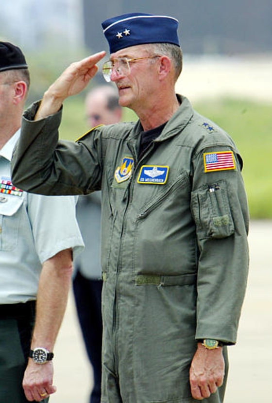Standing on the steamy tarmac in his flight suit, Air Force Reserve Maj. Gen. Edward Mechenbier saluted two aluminum cases draped in American flags as they were loaded onto the C-141, dubbed the "Hanoi Taxi" by POWs who rode it home after their release.