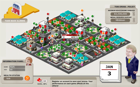 In the health care portion of "Take Back Illinois," for example, tiny townspeople amble through a crisply animated downtown area. Small bubbles above their heads indicate wellness. The goal is to keep the hospitals open by minimizing medical malpractice awards. Fail that goal and the hospitals fade to gray -- leaving the townspeople to their fate.