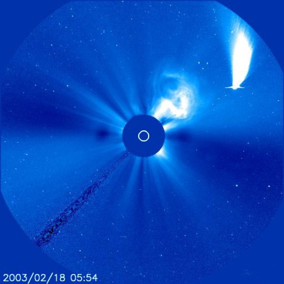 During February 2003, SOHO caught the comet C/2002 V1 NEAT swing by the sun during a CME event, which researchers believed caused a kink in the icy wanderer's tail. The catch was a fortunate one, since NEAT's orbit brought it close to the sun in astronomical terms, about one-tenth the distance between Earth and the sun or 0.1 astronomical units. One astronomical unit, or AU, is about 93 million miles (150 million kilometers).