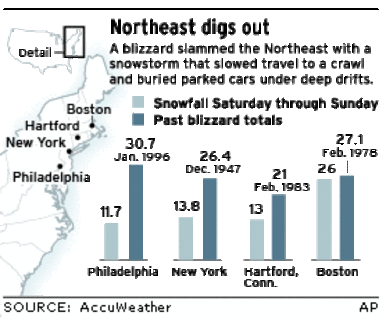School closings were reported from Maine to parts of Virginia. The storm dumped more than 3 feet of snow on Massachusetts, and drifts were piled up to the eaves of some one-story buildings.