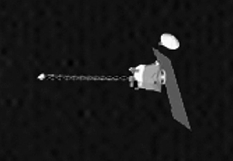 Because of the distance between Global Surveyor and Mars Express, the European orbiter appears as little more than a narrow blur in the final composite image. But astronomers analyzing the image said the Express probe appeared to be about 1.5 meters by 15 meters (5 by 50 feet) in dimensions, which is consistent with what they would expect from the Global Surveyor spacecraft’s vantage point.