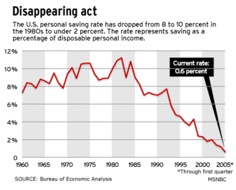 As for cash savings, it has virtually disappeared in a nation where consumers rely heavily on debt to finance a lifestyle that remains barely within their means. The personal saving rate, one measure of how effectively wage-earners set aside money for retirement and other future expenses, has plunged to well under 2 percent of disposable personal income in recent years, compared with 8 to 10 percent in the 1960s, ‘70s and ‘80s.
