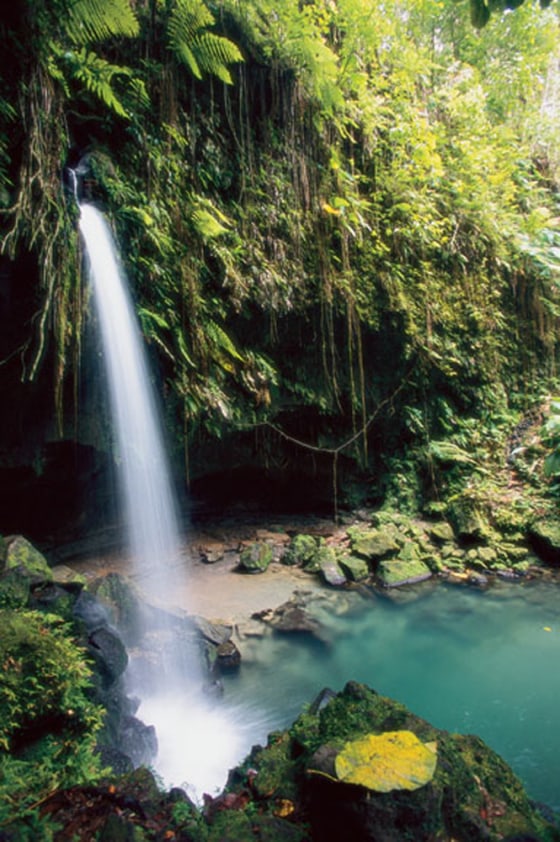 Hundreds of rivers flow down the mountains. Some, dipping close to the molten heart of the island, run hot. Where these feeder streams join a larger river, you find spots where the locals have piled rocks to create natural hot tubs. Upriver, deep in the forest, lie some of the Caribbean’s most breathtaking sights: thundering waterfalls, hidden lakes and clear green pools framed by exotic flowers and dangling vines.