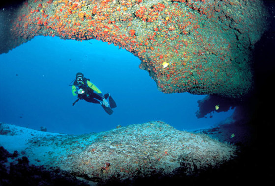 “You’re guaranteed to see sea turtles, lots of them. Big ones, too. Sheraton Caverns is crawling with them, and they know they’re protected, so expect eyeball-to-eyeball encounters,” the divemaster for PADI Dive Center Seasport Divers says.