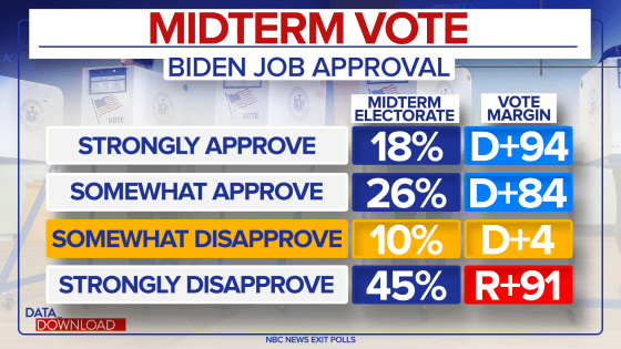 And among those voter groups, "somewhat disapprove" was the only segment where the vote was even close. Voters who “strongly approve” of Biden voted Democratic by about 94 points. Voters who “somewhat approve” of Biden voted Democratic by an 84-point margin. And voters who “strongly disapprove” of Biden were a mirror image of those two groups, voting for Republicans by 91 points.