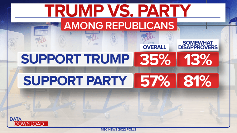 The NBC News Poll asks Republicans whether they primarily support Trump or the Republican Party and among Republicans overall the percentage that say they support the party more than Trump has grown to a majority, 57% in the 2022 data.