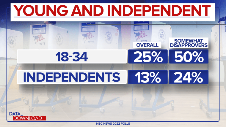 The NBC News poll data shows that 50% of the "somewhat disapprove" bloc sits in the 18 to 34 age group. That number is twice the national average. Overall, 18- to 34-year-olds made up only about 25% of the voters in the surveys over in 2022.