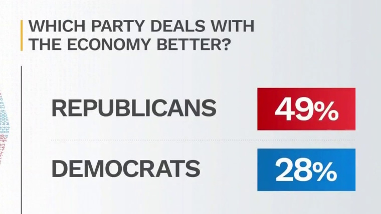 The numbers illustrate the feelings of an electorate that has grown deeply dissatisfied with President Joe Biden — but also maintains serious reservations about his most likely rival in the 2024 presidential race, former President Donald Trump. Indeed, the GOP advantage on the economy is the highest recorded in more than three decades of NBC News polling. But it’s at about the same level as it was in September 2022, before Democrats notched surprisingly strong midterm election results in part because of those voter concerns about the GOP.