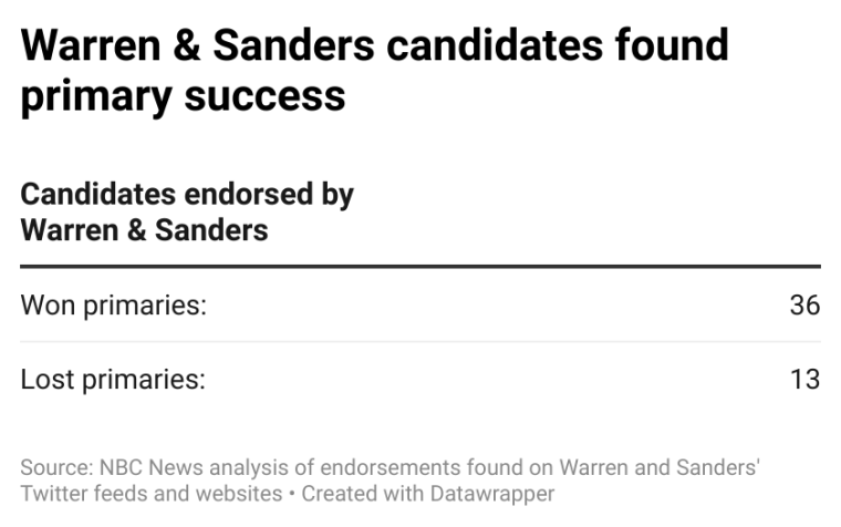 Sanders and Warren particularly showed their influence in open seat races, where 10 of Warren’s endorsed candidates prevailed, and eight of Sanders’ candidates won the Democratic nomination.