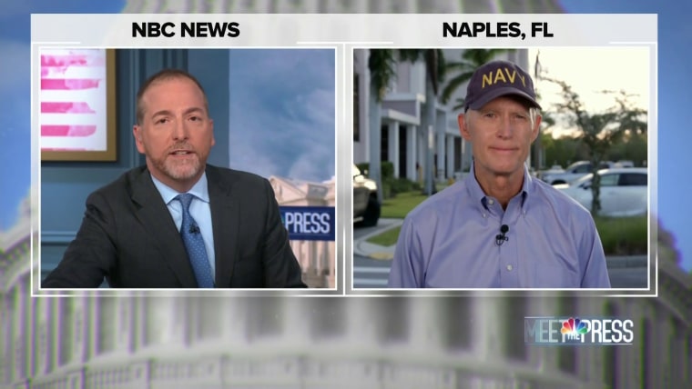 Florida Sen. Rick Scott (R-Fla.) discusses the state’s responsibility regarding building codes for mobile homes during an interview with Meet the Press. Mobile homes in Southwest Florida were affected by Hurricane Ian. Damage costs are estimated to be in the billions. during an interview with Meet the Press.Oct. 2, 2022
