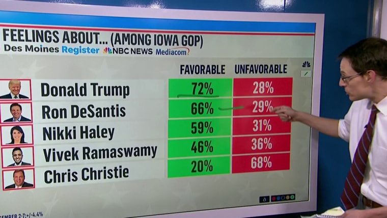 Former President Trump's support is growing in the weeks leading up to the Iowa Caucus, especially with evangelicals and first-time caucusgoers in the latest NBC News/Des Moines Register/Mediacom poll. NBC News Political Correspondent Steve Kornacki joins Meet the Press NOW to share the one piece of good news for Trump's primary opponent Gov. Ron DeSantis (R-Fla.)Dec. 11, 2023