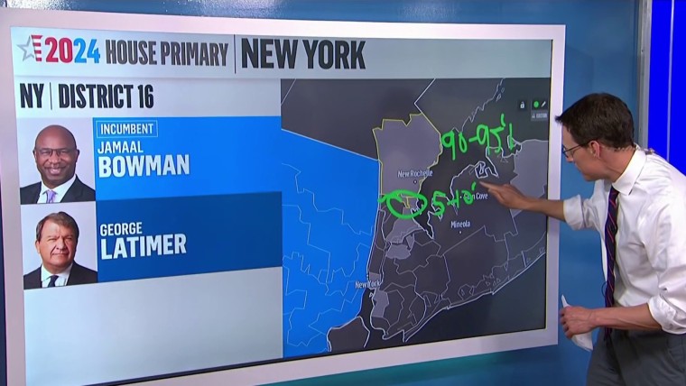 Rep. Jamaal Bowman (D-N.Y.) and Rep. Lauren Boebert (R-Colo.) are facing tough primary challenges. NBC News National Political Correspondent Steve Kornacki sets the stage for what to expect in Tuesday’s elections.June 25, 2024