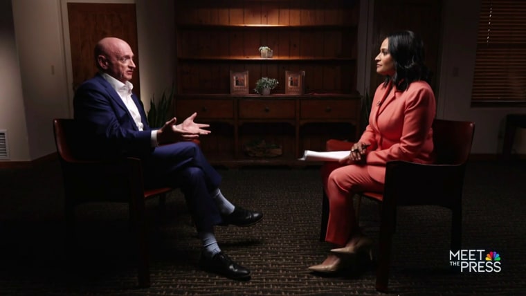 During an exclusive interview with Meet the Press, Sen. Mark Kelly (D-Ariz.) reacts to Republican Arizona Senate candidate Kari Lake telling her supporters to “strap on a Glock” to prepare for the election.May 5, 2024
