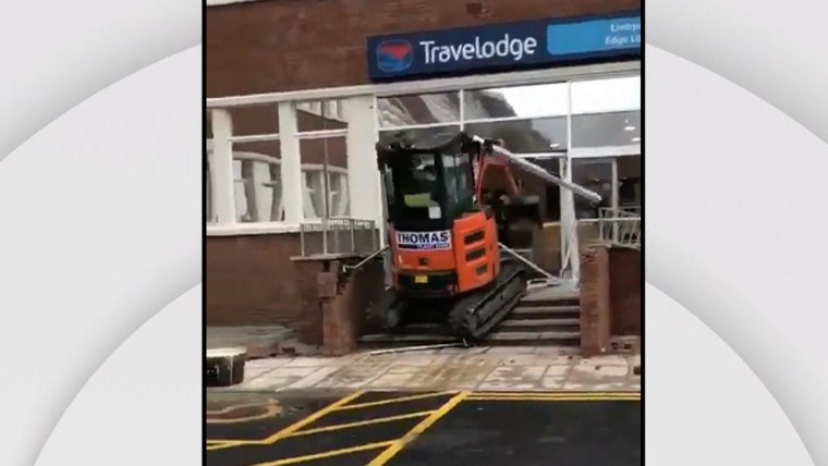 The man behind controls of an excavator was recorded ramming through the front doors of a future Travelodge hotel in Liverpool on Monday afternoon and tearing apart what would be its lobby.