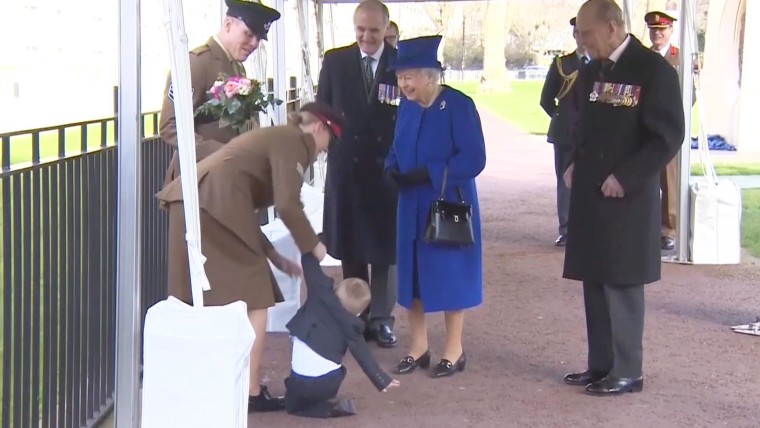 Queen Elizabeth II unveiled a new war memorial in London, but was upstaged when an uncooperative two-year-old decided to throw a tantrum