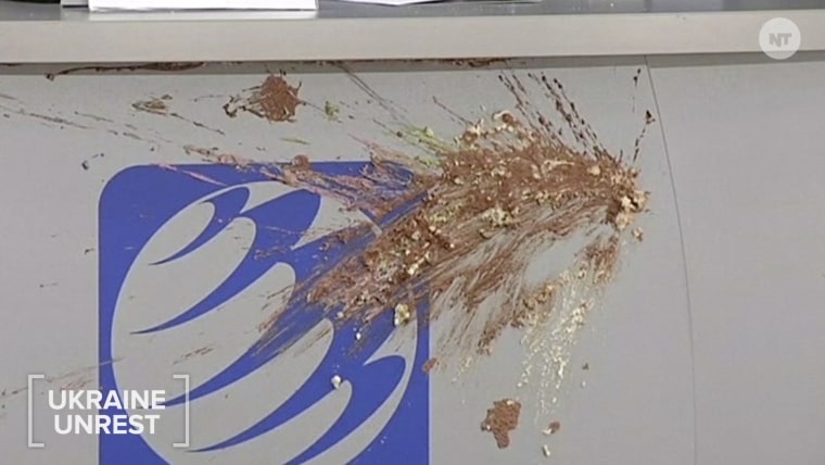 Politicians in Ukraine — and now their staff — are getting a true taste of public opinion. After lawmakers have been filmed getting tossed into garbage bins by unruly crowds, another strange incident has been caught on camera: An unidentified hooded man threw an entire cake at Oleh Makhnitsky, an aide to President Petro Poroshenko.