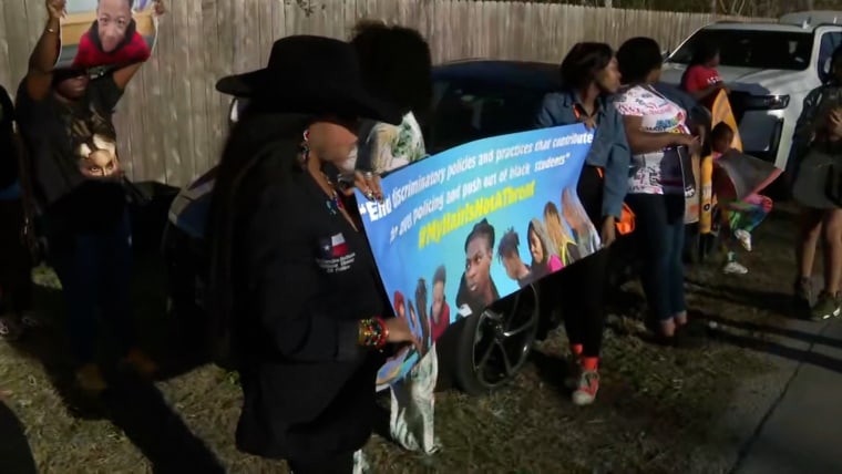 BAYTOWN, Texas — Two dozen protesters gathered near a Texas superintendent’s home on Wednesday to support a Black teen who has been suspended for most of the school year over the length of his dreadlocks.