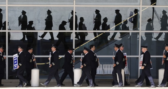 American Airlines pilots march in protest outside a terminal at Dallas-Fort Worth International Airport in Grapevine, Texas, Wednesday. Pilots and airlines management are in talks on a new contract as the company works through bankruptcy.