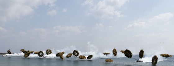 Amphibious assault vehicles of the South Korean Marine Corps launch smoke bombs as they move to shore during a U.S.-South Korea joint landing operation drill in Pohang, about 230 miles southeast of Seoul, on April 26, 2013. The drill is part of the two countries' annual military training called Foal Eagle, which began on March 1 and runs until April 30.