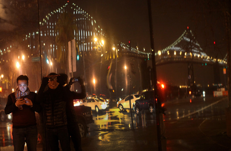 People photograph a lighted art display of the San Francisco-Oakland Bay Bridge as it is reflected in a window, in San Francisco, Calif. on Tuesday, March 5, 2013. The Bay Bridge - no. 2 to its famous neighbor, Golden Gate - was decorated with some 25,000 lights by artist Leo Villareal, making a massive illuminated sculpture.