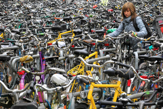 A woman parks her bicycle outside a railway station in Ghent, Belgium on Tuesday, Oct. 2, 2012. Thousands of people ride bicycles in the city when traveling short distances.
