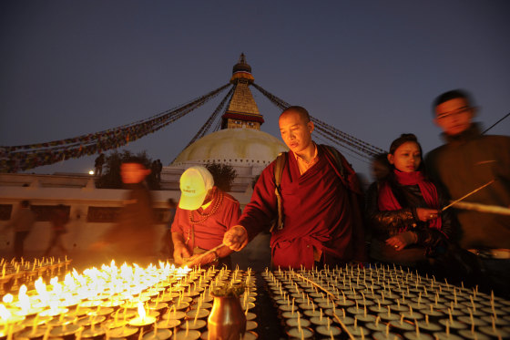 A Buddhist monk lights a candle at the Boudhanath Stupa during a full moon festival in Kathmandu, Nepal, Oct. 29, 2012. The Boudhanath Stupa was declared a world heritage site by UNESCO in 1979.