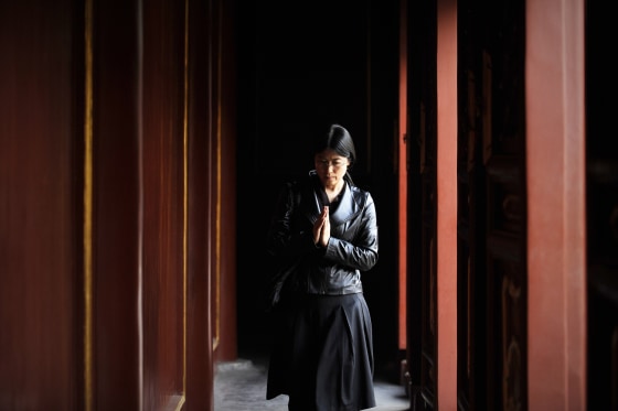 A woman prays as she walks through a corridor at the Yonghegong Lama temple in Beijing, Oct. 24, 2012. China's religious affairs ministry has lashed out at the rampant commercialization of sacred places and temples in the country, including the practice of employing "fake monks" and fortune-tellers.