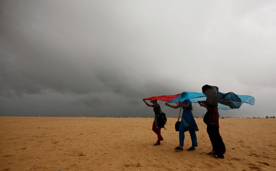 Indian women cover their faces with scarves flying in the wind as rain clouds loom over the sky at the Marina beach in Chennai, India, on Oct. 19. Heavy rains lashed the city Friday causing traffic congestion in several parts of the city.
