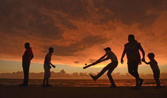 A boy hits a ball as people walk along the seafront in Colombo, Sri Lanka, Oct. 6, 2012. The World Twenty20 cricket final will be played Sunday in Colombo.