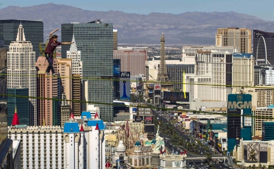 Daredevil slackline athlete Andy Lewis warms up before setting the world record for the longest urban highline walk in Las Vegas on Oct. 16. The Las Vegas Review-Journal reported that Lewis completed the 360-foot walk on a one-inch wide line 480 feet above the Las Vegas Strip.