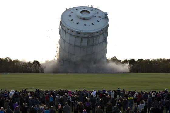 A crowd watches as Denmark's second-tallest building, a 108-meter-tall gas container in Copenhagen, is demolished on Nov. 4. The container had not been in use since 2007. The demolition was carried out by British specialist, John M. Faulkner with the Precision Demolition Company, and the structure fell in only eight seconds.