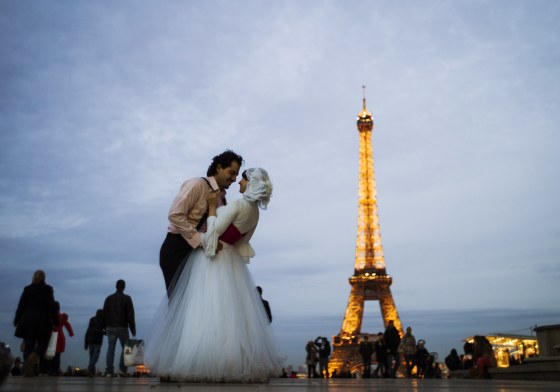 A married Egyptian couple kiss on the Trocadero esplanade in front of the Eiffel Tower on Oct. 29, 2012, in Paris.