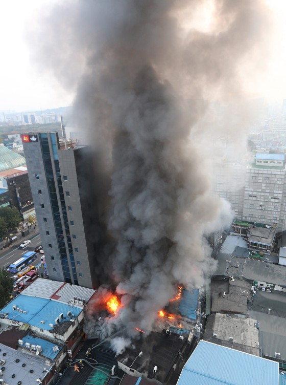 Smoke billowing from an area of restaurants fills the sky over Seoul's Jongno Ward on 31 October 2012, after the site was engulfed in flames.