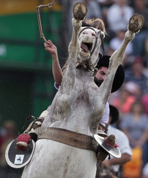 A gaucho rides an unbroken horse during the annual celebration of Criolla Week in Montevideo, Uruguay, on March 25, 2013.