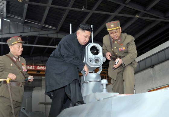 Kim Jong Un looks at the latest combat and technical equipment made by unit 1501 of the Korean People's Army, during his visit to the unit on March 24, 2013.KCNA via Reuters