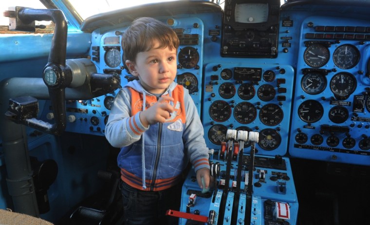 A child leans from the cockpit window of a plane at a kindergarten on October 31, 2012.David Mdzinarishvili / Reuters