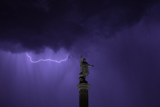 Lightning is seen in the sky above the Christopher Columbus monument at Madrid's Colon Square July 26, 2012.
