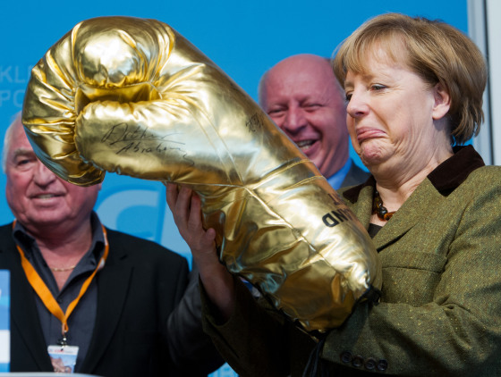 German Chancellor Angela Merkel grimaces as she holds a giant golden boxing glove during the representatives meeting of the Christian Democratic Party, CDU, in Grimmen, Germany, on Saturday. Standing in the background are CDU Bundestag member Eckhardt Rehberg right, and boxing coach Hans-Ullrich Wegner. Merkel has been elected unanimously to lead the electoral list in the northwestern German state. She received all of the 113 votes.