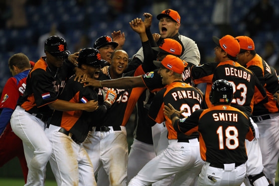 Members of the Netherlands team celebrate winning the World Baseball Classic Second Round Pool 1 game against Cuba at the Tokyo Dome on March 11, 2013 in Tokyo, Japan.