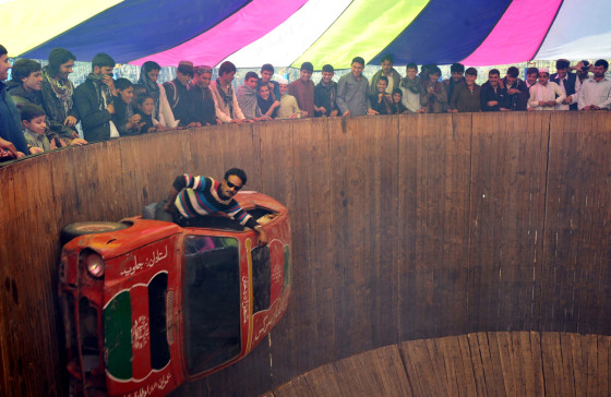 An Afghan circus performer drives a car on a 'Wall of Death' at a fair on the third day of Eid al-Adha in Jalalabad, Afghanistan, Oct. 28. Afghans started celebrating Eid al-Adha or 'Feast of the Sacrifice', which marks the end of the annual hajj or pilgrimage to Mecca and celebrated in remembrance of Abraham's readiness to sacrifice his son to God.