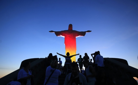 Tourists photograph the Christ the Redeemer statue lit in the colors of Germany's national flag in Rio de Janeiro, Oct. 3, 2012. The lit statue celebrates the anniversary of the reunification of Germany in 1990.