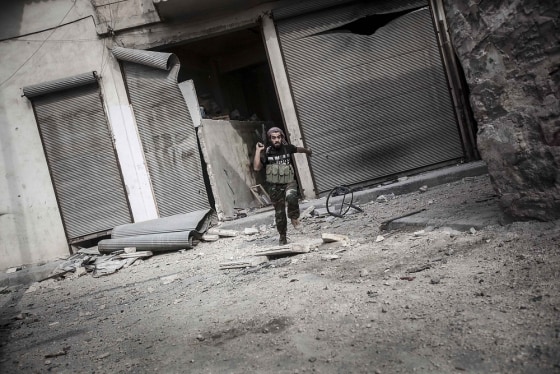 A rebel fighter runs for cover through a sniper line-of-fire at the Karmal Jabl front line in Aleppo, Syria, on Oct. 24. The image was captured Wednesday, but made available to NBCNews.com today.