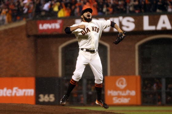 Pitcher Sergio Romo of the San Francisco Giants reacts after the Giants defeat the St. Louis Cardinals 9-0 in Game Seven of the National League Championship Series at AT&T Park on Monday night. Read the full story.