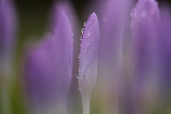 Raindrops hang on to Crocuses at Kew Gardens on March 1, 2013 in Kew, England. Today marks the first day of Spring, though the Met Office have said that temperatures are likely to be below average throughout March.